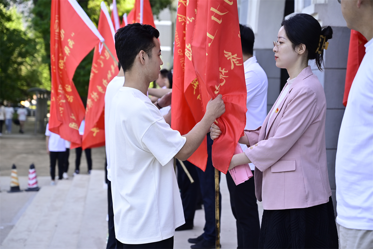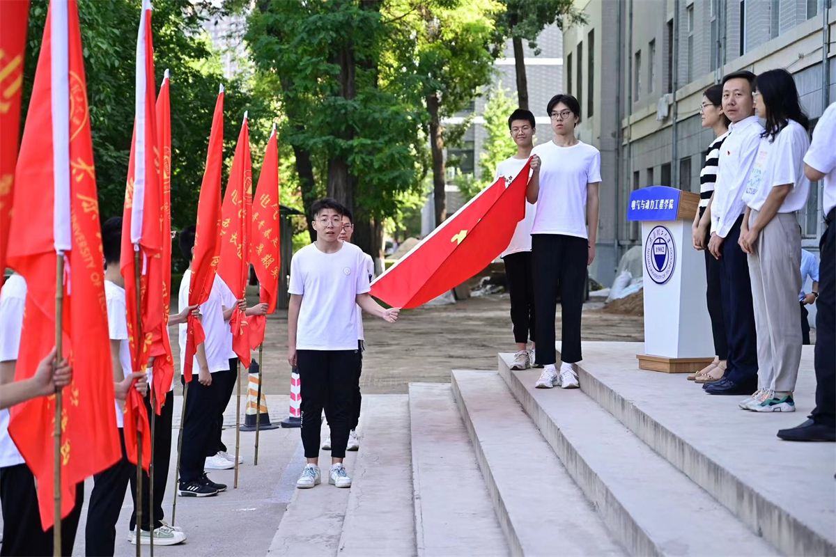 徐鑫和田韶华分别为新葡萄官网和太原市第二十九中学校实践队伍授总旗,郭春耀及各辅导员代表为重点队伍和专项队伍授队旗。