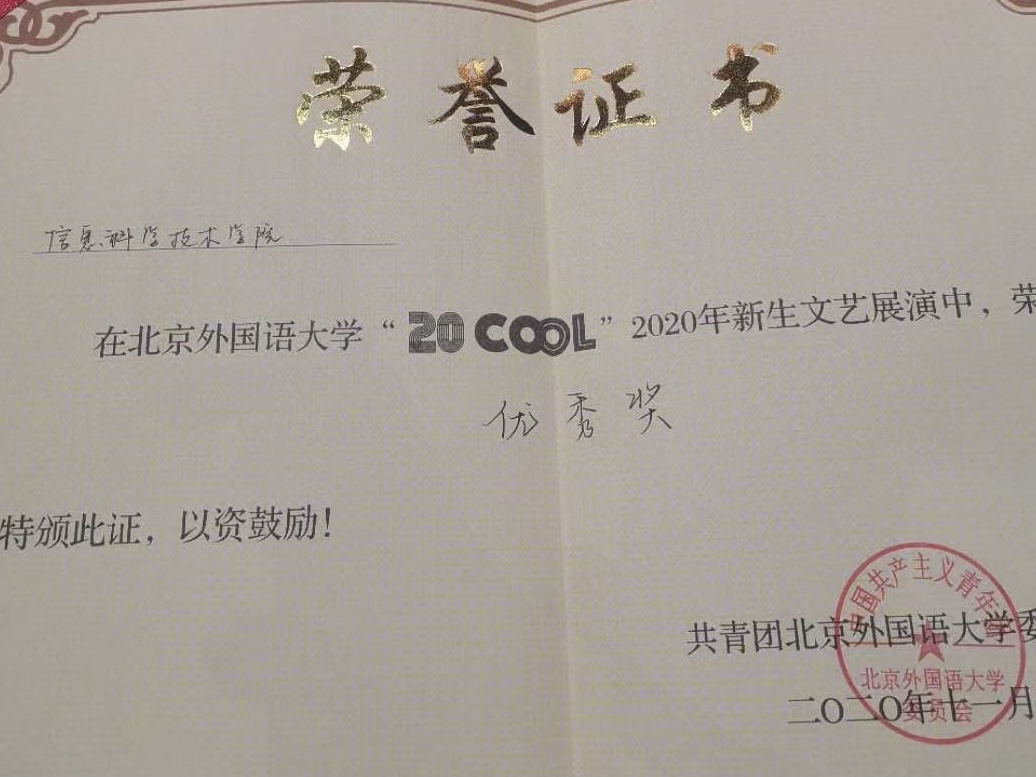 11月1日19:00,best365官网中文版登录“20 COOL”2020年新生文艺展演在千人礼堂举行。我院2020级新生准备的节目《忘了我 Remember me》在本次文艺展演中取得了“优秀奖”的成绩。