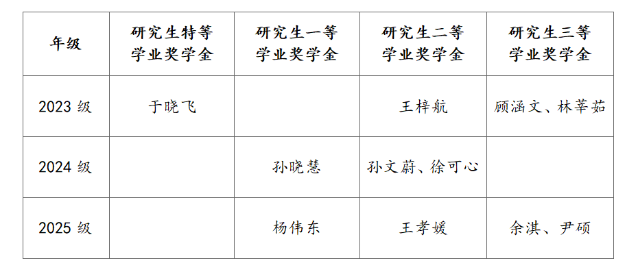 根据《best365官网中文版登录学生资助工作管理规定》、《best365官网中文版登录研究生学业奖学金评审办法(试行)》、《best365官网中文版登录研究生学业奖学金评审指标体系(实行)》,结合统考生评审指标及办法,经学生个人申报、班级推荐审核、团总支学生会汇总、学院评奖评优工作领导小组审定,学院2024—2025年度研究生学业奖学金评审结果如下(排名不分先后):
